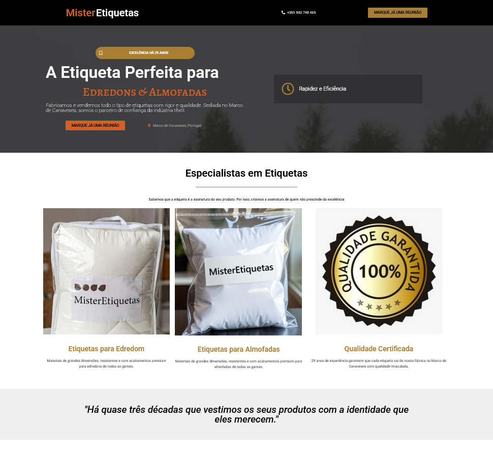 Landing de Apresentação de Nova marca de Etiquetas vocacionadas para Edredom e Almofadas.